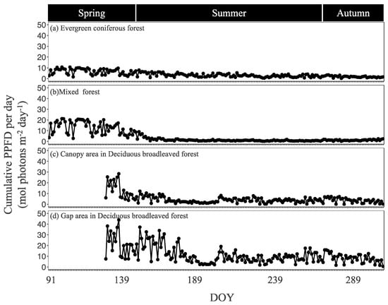 The seasonal trends of daily cumulative PPFD differed among the four sites (Figure 3). There was no notable seasonal dynamics in the evergreen coniferous forest. On the other hand, PPFD was highest in spring and then decreased in summer in the mixed forest and deciduous broadleaved forest, most sharply in the deciduous broadleaved forest canopy area. The cumulative PPFD during the whole growing period was 800.6 mol photons m−2 in the evergreen coniferous forest, 904.8 mol m−2 in the mixed forest, 819.3 mol m−2 in the deciduous broadleaved forest canopy area, and 1943.1 mol m−2 in the deciduous broadleaved forest gap area.