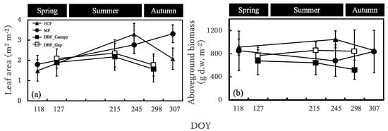 (a) Leaf area and (b) aboveground biomass of the Sasa community in the four sites. DOY, day of year. ECF, MF, DBF_Canopy and DBF_Gap in the graph indicate evergreen coniferous forest, mixed forest, and canopy area in the broadleaved deciduous forest and gap area in the deciduous broadleaved forest, respectively.