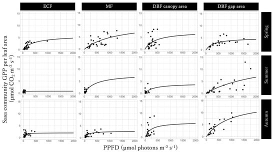 Light-Sasa community GPP curve in the evergreen coniferous forest (ECF), mixed forest (MF), deciduous broadleaved forest (DBF) canopy area, and DBF gap area in each season.