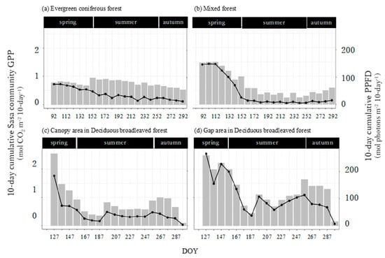 Seasonal dynamics varied widely in the mixed forest and deciduous broadleaved forest but not in the evergreen coniferous forest (Figure 7). In the mixed forest and deciduous broadleaved forest, the 10-day cumulative GPPSasa-community was largest in spring, decreased in summer, and then increased again in autumn (Figure 7b–d). This was similar to the 10-day cumulative PPFD (Figure 3). The last 10-day cumulative GPPSasa-community in the deciduous broadleaved forest was remarkably small because it only covered 2 days. The first 10-day cumulative GPPSasa-community was largest in the canopy area in the deciduous broadleaved forest. After that, the value was largest in the gap area in the deciduous broadleaved forest throughout the growing season.