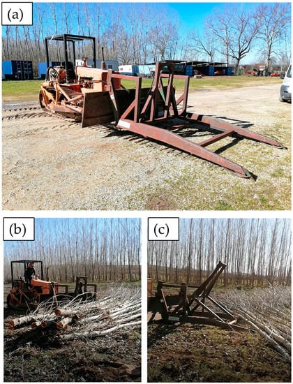 Extraction via CFL was carried out by felling half a row with the trees perpendicular to the row’s direction. The crawler tractor then moved towards the trees, loading them or simply pushing them outside the field. The extraction distance was, therefore, 50 m (half of the length of a row). A vision of CFL is provided in Figure 1.