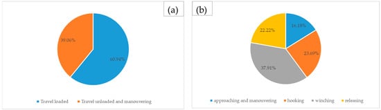 The share of working times (without considering delays) for the two different investigated extraction systems is provided in Figure 2. As it is possible to notice, for CFL, there were only two working phases: travel loaded (including loading and unloading of trees), which accounted for more than 60% of total net time; and travel unloaded, which corresponded to about 40%. Regarding WINCH, the share of working times is more complex, referring to four different phases, of which the one that accounted for the major percentage of working times was winching.