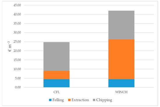The results of cost analysis for producing wood chips with the investigated harvesting systems are provided in Figure 3. The substantial difference in extraction productivity between the two systems led to a much lower cost for CFL in comparison to WINCH. Cost for extraction with CFL was indeed 4.61 EUR m−3, while in WINCH, the cost was 21.83 EUR m−3.