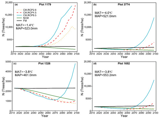 44]. By contrast, the predicted number of trees by the CM under three different climate change scenarios, in general, indicated a pronounced increasing pattern, though plot 1326 showed a decreasing pattern before 2070 (