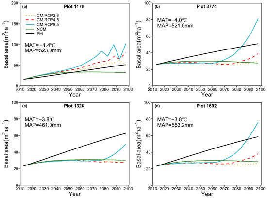 Figure 6). A similar increasing pattern was also detected for the basal area under the three different RCPs (