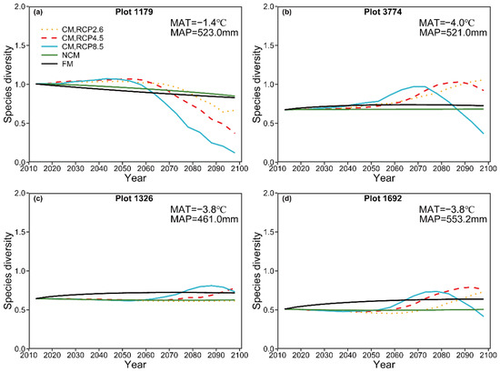For long-term prediction, the predicted species diversity by the NCM, in general, showed almost no variation in time series, though a slightly decreasing trend was detected for plot 1179. By contrast, the species diversity predicted by the CM under these three climate change scenarios first shows an increasing pattern and then decreases, suggesting that species diversity could be negatively influenced by climate change. Many authors [