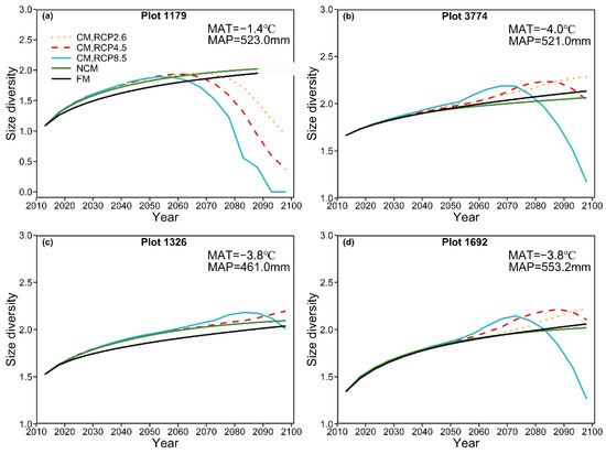 80] projected late 21st-century distributions for 1350 European plants species under seven climate change scenarios and found that more than half of European plant species could be vulnerable or threatened by 2080. Moreover, we observed that the predicted patterns of species diversity shared similar tendencies as emissions. The long-term predicted size diversity by the CM under three RCPs shared the same trend with the predicted species diversity, indicating climate change (increasing CO
