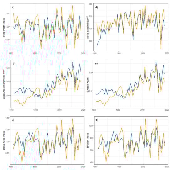Mean Chronologies of (a) Ring Width Index (RWI), (b) Basal Area Increment mm2 (BAI), (c) Detrended Basal Area Increment (BAI.i), (d) Mean ring Wood Density Kg m−3 (relative values), (e) BAIden and (f) BAIden.i. Blue lines represent the mean chronologies of pines in pure forests (n = 18), orange lines represent the chronologies of pines in mixed forests (n = 18). The detrended chronologies were obtained applying a smoothing spline with n-years= 30 per each series. Mean value chronologies were built with a bi-weight robust mean and by pre-whitening with an autoregressive model.