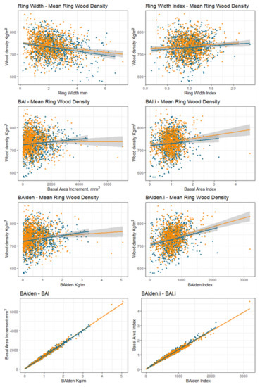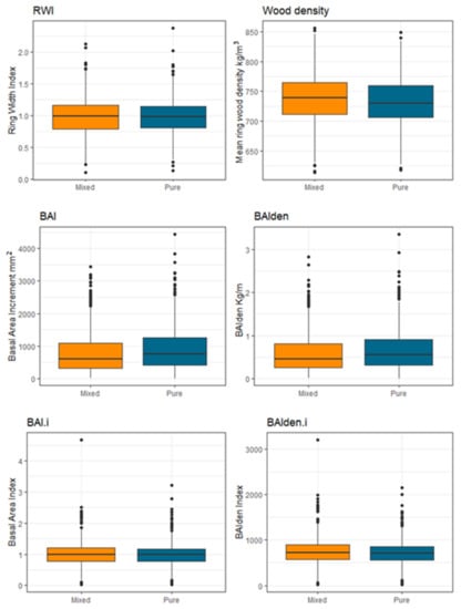 Observing the mean chronologies, the mature stage of trees can be identified after the mid-1980s, when the growth curve began to plateau (Figure 2b,d). Comparing pines growing in pure with pines growing in mixed forests, the chronologies RWI, BAI.i, BAIden.i and BAI and BAIden showed a similar pattern. Wood Density as well, presents a similar trend in the two forest stand types, but shows more dissimilarities than the other chronologies (Figure 2d). The main differences among the mixing type specific chronologies was identified in a few years of the juvenile stage. Wood Density decreased as the ring width increased in pines in both forest types (Figure 3). When BAI increased, Wood Density increased consistently for P. sylvestris in pure forest, and showed no trend for P. sylvestris in mixed forests (Figure 3). This could be related to the high variability at the individual tree level, considering the sample size (n = 18 trees per forest types), and to an unequal representation of the juvenile stage of trees, hence of wider rings, as not all the cores hit the pith of trees and several juvenile years were missing. Wood Density presented a weaker correlation with BAIden (R2 = 0.03 pure, R2 = 0.01, mixed forest) and BAIden.i (R2 = 0.05 pure, R2 = 0.07, mixed forest, Figure 3). Conversely, BAIden resulted in high correlated with BAI (R2 = 0.99 pure and mixed forest, Figure 3), and consistently also BAIden.i with BAI.i (R2 = 0.97 pure and R2 = 0.97 mixed forest, Figure 3). This likely indicates that the component BAI weights more than Wood Density in determining the final values of BAIden. When BAIden/BAIden.i increase, also the BAI/BAI.i e Wood Density increases consistently (Figure 3). Boxplots in Figure 4 illustrate the differences between the variables investigated in both forest types (orange mixed forest, blue pure forest).