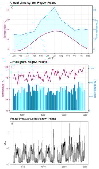 (a) Annual Climatogram for Rogow, mean annual temperature = 8 °C, mean annual precipitation = 563 mm, obtained by averaged values from the time span 1952–2018. (b) Climatogram for Rogow. Time span 1952–2018. Line represents mean temperature, bars represent precipitation. (c) Vapor pressure deficit, average values at monthly resolution. Time span 1962–2018.