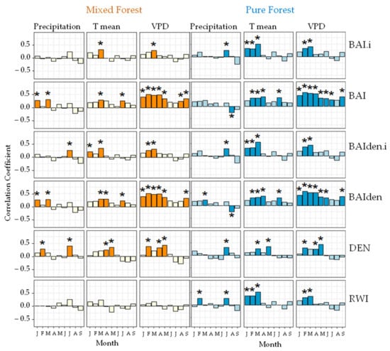 Correlations between monthly mean Temperature, monthly Precipitation and monthly Vapor Pressure Deficit of the current year (Jan–Sep) and RWI, BAI.i, BAI, Wood Density (DEN), BAIden.i, BAIden series in the two forest types, for the time span 1962–2018. The height of the bars represents the correlation coefficient (R2), the bootstrap method applied to the analysis give information regarding the confidence interval, and the significance of the correlation. Darker bars, also indicated by *, indicate a significant correlation (p < 0.05), while lighter bars indicate a non-significant correlation (p > 0.05). Correlation was performed with the dcc function from treeclim Rpackage. The function is set on correlation, where the coefficients are univariate estimates of Pearson’s product moment correlation.