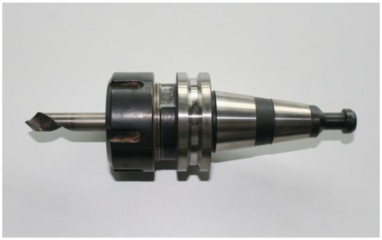 General view of the drill bit (shank part diameter—10 mm; shank length—27 mm; total length—70 mm; number of teeth—1) with a tool holder (ISO 30, ER 32).