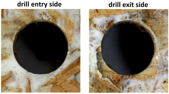 One of the primary objectives of the study was to monitor and compare the hole quality (defined as a quality of the edges of the holes), which was seen on both sides of the drilled boards (i.e., on the side where the drill bit entered the materials and where it came out). A digital camera (Canon 40D) with an appropriate lens (Canon Macro Lens EF 100 mm 1: 2.8 USM) was used to monitor the hole quality. Sample photos of the hole taken on both sides of the particleboard are shown in Figure 2.