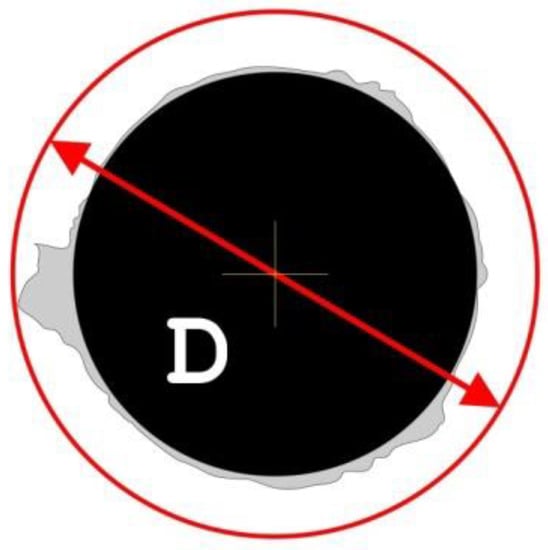 The photographs were analyzed using CorelDRAW Graphics Suite graphical software. This way, the maximum width of the damage zone (visible around the hole on both sides of the board) was measured for each hole. When looking for the border of the damage zone, the researchers analyzed any signs of surface destruction such as fiber pullout, fiber fragmentation, burr, bulge or structure crack. After locating the border of the external damage area, the characteristic diameter (marked with the symbol D and shown in Figure 3) of the specific circle was determined. The center of this specific circle was on the symmetry axis of the hole and the circle passed through the farthest boundary point (Figure 3). The maximum width of the damage zone (marked with the symbol W) was calculated using the following formula: