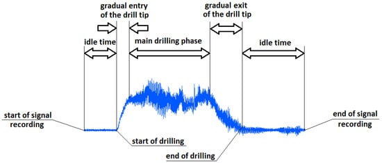 Another objective of the study was to measure and compare the feed force and torque, generated when drilling holes in various materials. Therefore, the experimental procedure involved the use of a specialized, accurate system for measuring cutting forces. The scheme of the system is shown in Figure 4. The force-torque measuring system was built using a special platform based on the piezoelectric dynamometer using a 2-component sensor (Kistler 9345, Winterthur, Switzerland). This sensor was designed to monitor the feed force (F) and the cutting torque (T). The measurement system also included other elements: a signal amplifier (Kistler ICAM 5073A, Winterthur, Switzerland), a connector block (NI BNC-2110, Austin, TX, USA), and a data acquisition system (NI PCI-6034E, Austin, TX, USA). All recorded signals were analyzed in NI LabVIEW environment. Based on the recorded feed force and torque signals, their average values were determined during “the main drilling phase”. The additional figure (Figure 5) shows typical changes in the feed force signal to explain what the “the main drilling phase” was.