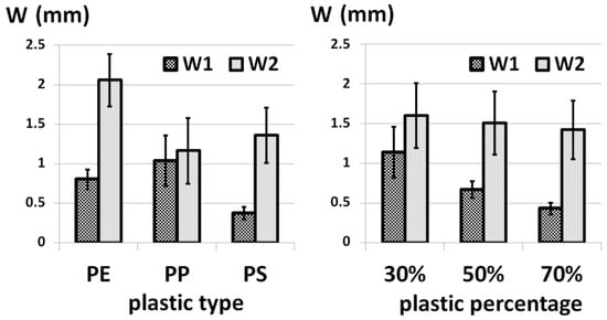 The effect of the plastic type and the wood–plastic ratio on the quality of the holes, which were analyzed on both sides of the boards (W1 [mm] and W2 [mm] are the maximum widths of the damage zones visible around the hole on the drill entry side and the drill exit side, respectively).