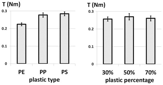 The effect of the type of plastic and the wood–plastic ratio on the drilling torque (T [Nm]).
