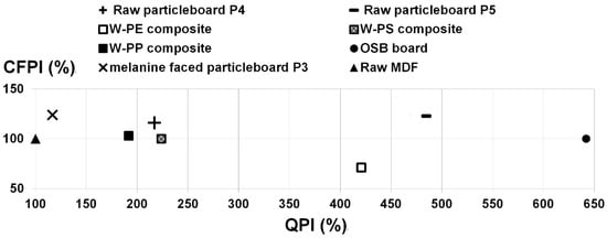The general differentiation of the five standard wood-based boards and the three innovative wood–plastic particleboards in terms of difficulty in drilling, determined by two independent indexes (QPI and CFPI, which have been defined by mathematical Equations (2) and (3) in Section 2, is shown in Figure 9. This figure shows the machinability of wood–polyethylene (W-PE), wood–polypropylene (W-PP) and wood–polystyrene (W-PS) composites with 50% plastic content. Such a ratio of wood to plastic was considered most representative because it is the most common ratio in commercial WPCs. Referring to Figure 9 (which is a two-dimensional machinability chart), the machinability of the innovative particleboard and the standard particleboards (e.g., P3, P4, P5, and OSB) or standard medium-density fiberboard (MDF) can be compared. The quality criterion (QPI) differentiated the tested materials considerably more than the cutting force criterion (CFPI). The QPI varied from 100% to almost 500%, and the CFPI varied from 70% to 130%. It turned out that the machinability of W-PP and W-PS composites was relatively good and generally alike each other and alike the machinability of raw, standard particleboard P4. The machinability indicators of W-PE were completely different. W-PE turned out to be the best out of the wood-based boards (even better than standard MDF) from the cutting force criterion standpoint. On the other hand, the quality of the holes made in this material was very poor (not much better than in raw, standard particleboard P5).
