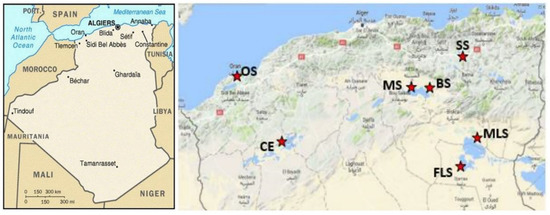 Map of sampling locations. SS, Soukhna sebkhet; BS, Baniou sebkhet; MS, Mcif sebkhet; OS, Oran sebkhet; MLS, Melghir sebkhet; FLS: Felghir sebkhet; CE, Chott Echerguie.
