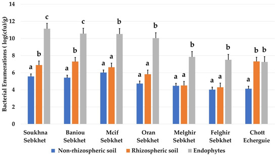 The average densities of endophytic bacteria were significantly higher compared to those of rhizospheric and non-rhizospheric soil in all studied sites (Figure 3). The number of endophytic bacteria was remarkably higher in Soukhna and Baniou sebkhet, which were characterized by the lowest values of Ec (11.29–23.5 ds/m). The sebkha soils of Mcif, Oran, Felghir and Melghir presented the same profile of isolated bacteria in endophytic, rhizospheric and non-rhizospheric samples. However, the extreme site of Chott Echerguie presented a remarkable number of rhizospheric bacteria, despite its high salinity (32.5 ds/m). It seemed that there was no relation between soil salinity and bacterial population across the studied areas.