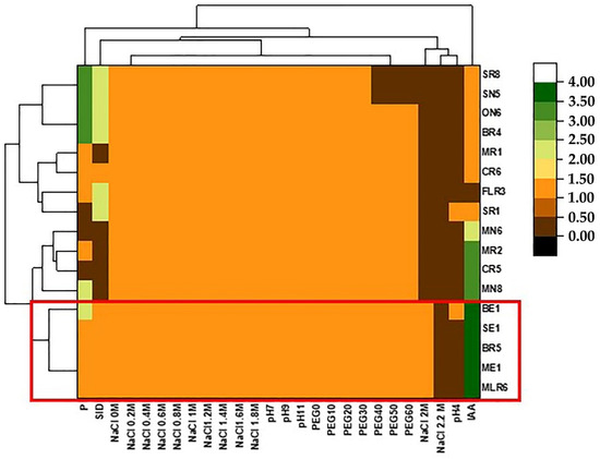 Heat map showing the response of the isolates to different stress tolerance (NaCl, pH, and PEG) and the expression of their PGP activities (IAA, P, and SID). The bacterial isolates (BE1, BR5, ME,1 SE1, and MLR6) having the best capacities are highlighted with the same colors.