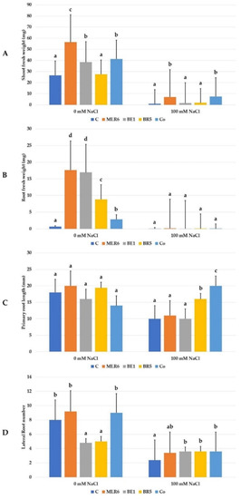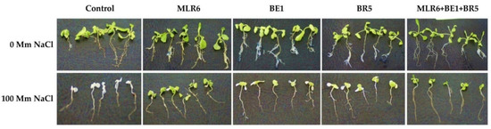 The inoculation of A. thaliana with the three selected strains and their coculture (MLR6, BE1, BR5, and MLR6 + BE1 + BR5) was used to assess their capacity to improve growth under 0 and 100 mM of NaCl (Figure 8). Analysis of morphological parameters of the plants, fresh weight, root weight, primary root elongation, and lateral root number (Figure 9) showed a significant decrease in these different growth parameters under salinity stress. Bacterial inoculation significantly improved the shoot and root fresh weight (Figure 9) of A. thaliana in the absence of NaCl stress compared to non-inoculated plants. The best bacteria effect was recorded to MLR6 for increases in shoot fresh weight (Figure 9) and both MLR6 and BE1 for root fresh weight (Figure 9). Any significant enhancement was observed on root length and lateral root number in inoculated plants compared to control. However a negative effect from the bacteria was observed in plants inoculated with BE1 and BR5 on lateral root number (Figure 9). Under saline conditions, the plants inoculated with the MLR6 strain and the co-culture showed significant enhancement in shoot weight, as compared to control plants (Figure 9). A similar increase in primary root length was observed in plants inoculated with both BR5 and the co-culture, which noted the better response (Figure 9). The MLR6, BR5 and BE1 and their co-culture improved lateral root number in inoculated plants compared to control plants (Figure 9). However, they did not have any significative enhancement in root fresh weight.