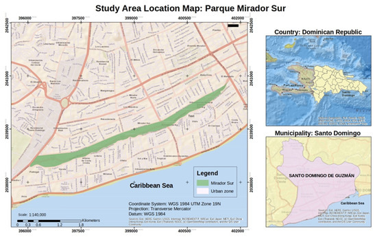 The research was carried out in the Mirador Sur Park, located in Circumscription 1 to the southwest of the National District, capital of the Dominican Republic, located in the Greater Antilles of the Caribbean (Figure 1). The geographic coordinates of the National District correspond to 18.476389 latitude, −69.893333 longitude. The city has a surface area of 91.6 km2, a population of 965,040 inhabitants, and a population density of 10,538 inhabitants/km2 [35,36]. The study area is territorially divided into three wards [35].