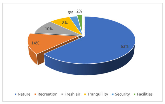 When asked about their main motivation for visiting the park, 63% of those interviewed said that they do so to enjoy nature. Moreover, 14% do so for recreational activities, and 10% to enjoy a space with quality air. Other motivations are related to tranquility 8%, a perception of security 3%, and the facilities that the park offers visitors 2% (Figure 3).