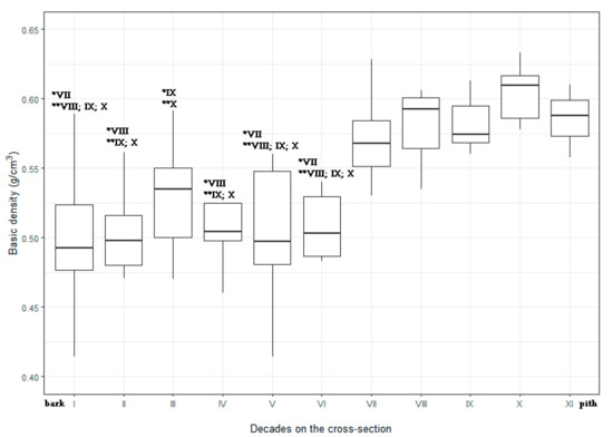 Distribution of basic density (g/cm3) on the cross-section of the trunk from bark (section I) to the pith (sections X/XI) with marked * significant and ** highly significant differences between wood samples using Tukey’s HSD test. Whiskers corresponding to minimum and maximum values, boxes represent the 1st and 3rd quartile values, midlines indicate the median.