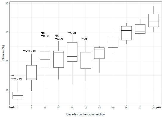 Distribution of mean Resi amplitude (%) on the cross-section of the trunk from bark (section I) to the pith (sections X/XI) with marked * significant and ** highly significant differences between wood samples using Tukey’s HSD test. Whiskers correspond to minimum and maximum values, boxes represent the 1st and 3rd quartile values, midlines indicate the median.