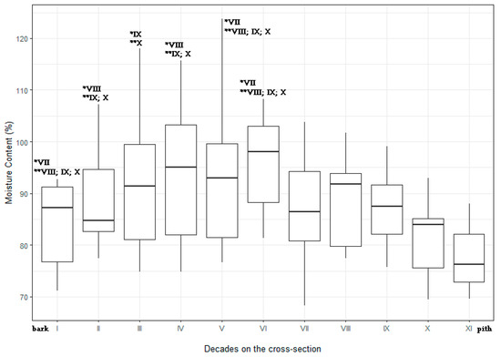 Changes of moisture content (%) on cross-section of the trunk from bark (section I) to pith (sections X/XI) with marked * significant and ** highly significant differences between wood samples using Tukey’s HSD test. Whiskers correspond to minimum and maximum values, boxes represent the 1st and 3rd quartile values, midlines indicate the median.