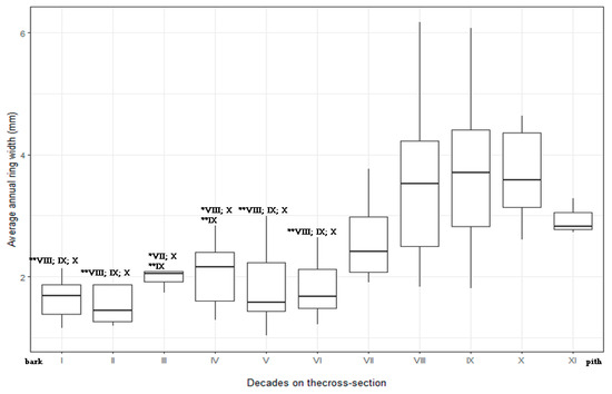 Changes of average annual ring width (mm) on cross-section of the trunk from bark (section I) to pith (sections X/XI) with marked * significant and ** highly significant differences between wood samples using HSD Tukey test. Description: whiskers represent minimum and maximum values, boxes—1st and 3rd quartile values, midlines—median.