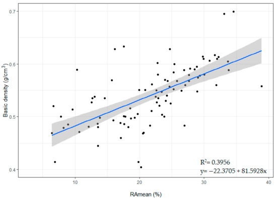 Coefficients of determination (R2) were calculated for the relationships between BD and RAmean, using linear regression. Significant relationships between examined properties were observed. The adjusted R2 for the pair BD–RAmean was 0.40 (Figure 6).