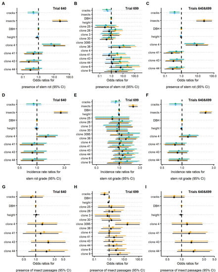 Forest plots of the multiple linear regressions (presented in different colors) with the presence of stem rot (A–C), stem rot grade (D–F), and presence of large polar borer passages (G–I) as dependent variables. Whiskers denote 95% confidence intervals (95% CI) of exponentiated coefficients. Non-overlap with the vertical intercept (dashed line) indicates statistically significant effect of an independent variable.