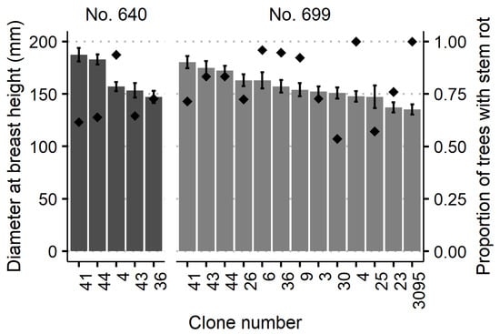 Clone mean diameter at breast height (bars; whiskers denote a 95% confidence interval) and the proportion of trees with stem rot (points) in the studied hybrid aspen trials 640 (age 13 years) and 699 (age 12 years).