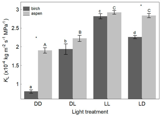 Mean values (±SE) of leaf hydraulic conductance (KL) depending on species and light treatment. DD—initial dark conditions; DL—initial light conditions (exposure to light for less than 1 h); LL—light conditions (exposure to PPFD 900–1000 μmol m−2 s−1 for 1–5 h); LD—final dark conditions (light turned off after exposure to light for 1–5 h). Different letters express statistically significant (p < 0.001) differences between light treatments within a species; asterisks denote statistically significant (p < 0.01) differences between species within a light treatment.