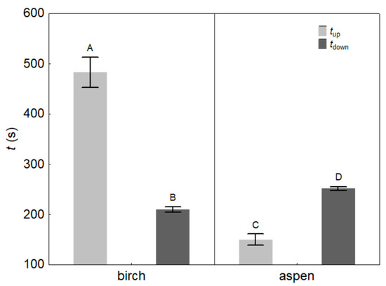 Mean values (±SE) of the up- (tup) and down-regulation (tdown) times of leaf hydraulic conductance of silver birch (Betula pendula) and hybrid aspen (Populus × wettsteinii). Different letters express statistically significant (p < 0.01) differences between the means.