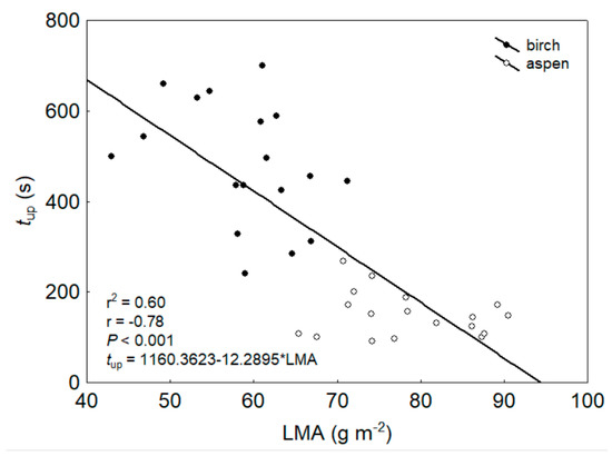 The times of up- and down-regulation of KL (tup and tdown) in response to turning the light on and off differed significantly between the species (Table 2). The mean tup was 483 ± 32 s for birch and 150 ± 12 s for aspen (p < 0.001), and the mean tdown was 210 ± 5 s for birch and 251 ± 4 s for aspen (p < 0.001; Figure 3). tup and tdown differed significantly from each other. In birch, tup was 2.3 times longer (p < 0.01) than tdown, while the opposite trend was observed in aspen, in which tdown was 1.7 times longer (p < 0.01) than tup (Figure 3). Across species, tup was strongly and inversely related to LMA (r2 = 0.60, p < 0.001; Figure 4).
