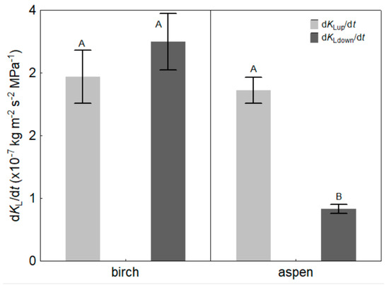 The up-regulation rate of KL (dKLup/dt) did not differ between the species; the corresponding mean values were 2.94 ± 0.44 × 10−7 and 2.72 ± 0.22 × 10−7 kg m−2 s−2 MPa−1 for birch and aspen, respectively (p = 0.667; Figure 5). Additionally, the initial up-regulation rate of KL (bup) did not differ significantly between the species (p = 0.193). However, the down-regulation rate of KL (dKLdown/dt) differed substantially between species, and the corresponding means were 3.50 ± 0.47 × 10−7 and 0.83 ± 0.08 × 10−7 kg m−2 s−2 MPa−1 for birch and aspen, respectively (p < 0.01), exhibiting 4.2 times faster down-regulation in birch leaves (Figure 5). For birch, there was no significant difference between the up- and down-regulation rates of KL, whereas for aspen, dKLup/dt was 3.3-fold faster than dKLdown/dt (p < 0.01).