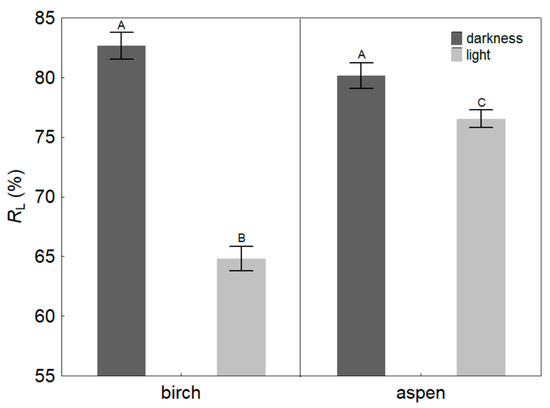 Relative hydraulic resistance (mean ±SE) residing in leaves (RL) of silver birch (Betula pendula) and hybrid aspen (Populus × wettsteinii) under dark or light conditions (exposure to PPFD 900–1000 μmol m−2 s−1 for at least 1 h). Different letters express statistically significant (p < 0.01) differences between the means.