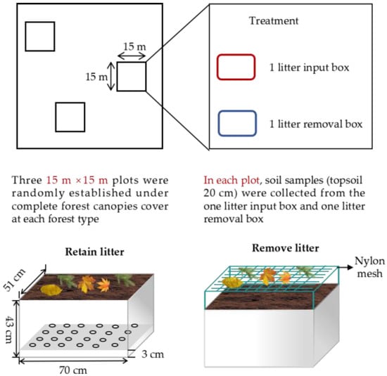 In May 2017, three plots with similar altitudes, slopes, and aspects were established in each forest type (Figure 1). Two in situ incubation boxes (depth 43 cm, length 70 cm, and width 51 cm) were installed at each plot throughout the study period. A perforated plastic sheet matching the incubator size was fixed 3 cm above the bottom of each box. At the same time, small holes were drilled into the bottom of each box to ensure that water flow could permeate without removing soil. All incubation boxes were left from May 2017 to October 2017 to reach equilibrium. In October 2017, soil samples were collected from the boxes to determine basic indicators. In each plot, three litter-input boxes and three litter-removal boxes (remove litter) were installed. For the litter-retain box, there was no litter interception net above the litter-input boxes to allow continuous litter input. The nylon mesh was secured with a bracket about 50 cm above the litter-removal boxes to capture all fallen litter.