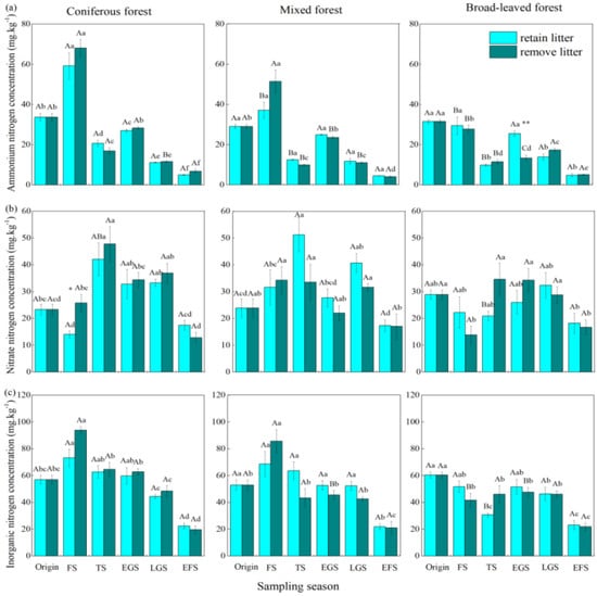Concentrations of soil ammonium nitrogen, nitrate-nitrogen, and inorganic nitrogen as affected by litter treatment at different sampling seasons in coniferous (a), mixed (b), and broad-leaved (c) forests. Values indicate the means ± standard error, n = 3. FS: freezing season, TS: thawing season, EGS: early growing season, LGS: late growing season, EFS: early freezing season. Asterisks represent the significant differences between different litter treatments in the same forest type and sampling season. Lowercase letters represent significant differences among different sampling seasons in the same litter treatment and forest type. Uppercase letters represent significant differences among different forest types in the same litter treatment and sampling season.