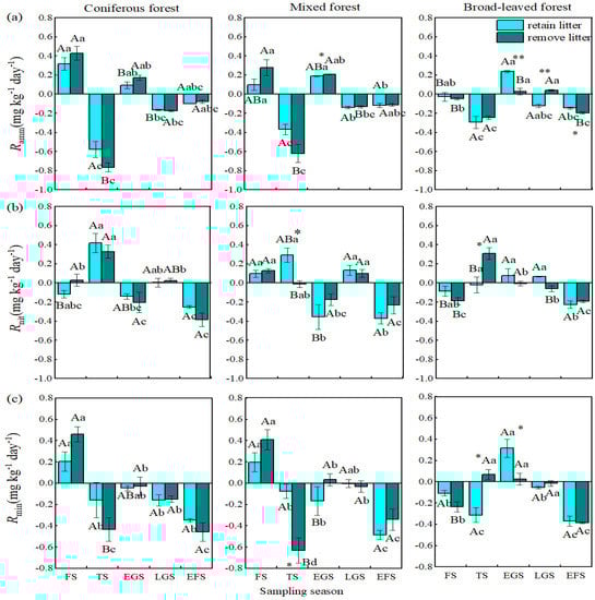 Effects of litter treatment on the net ammonification (a), nitrification (b) and mineralization (c) rates at different incubation stages in coniferous, mixed, and broad-leaved forests. Values indicate the means ± standard error, n = 3. FS: freezing season, TS: thawing season, EGS: early growing season, LGS: late growing season, EFS: early freezing season. Asterisks represent the significant differences between different litter treatments in the same forest type and sampling season. Lowercase letters represent the significant differences among different sampling seasons in the same litter treatment and forest type. Uppercase letters represent significant differences among the different forest types in the same litter treatment and sampling season.