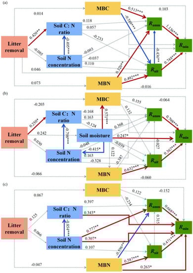 Structural equation models (SEMs) showing the effects of the litter treatment, soil moisture, MBC, MBN, N concentration, and C:N ratio on the net soil ammonification (Ramm), nitrification (Rnit), and N mineralization (Rmin) rates in coniferous (a), mixed (b), and broad-leaved (c) forests. Red (positive) and blue (negative) indicate significant and gray indicate insignificant (p > 0.05) effects, respectively. (a) Coniferous forest model satisfactorily fit the data based on the χ2 = 6.911, df = 7, χ2/df = 0.987, NFI = 0.955, CFI = 1.000, and RMSEA = 0.000. (b) Mixed forest model satisfactorily fit the data based on the χ2 = 10.767, df = 9, χ2/df = 1.196, NFI = 0.928, CFI = 0.983, and RMSEA = 0.078. (c) Broad-leaved forest model satisfactorily fit the data based on the χ2 = 10.118, df = 9, χ2/df = 1.124, NFI = 0.931, CFI = 0.990, and RMSEA = 0.062. * p < 0.05, ** p < 0.01, *** p < 0.001.