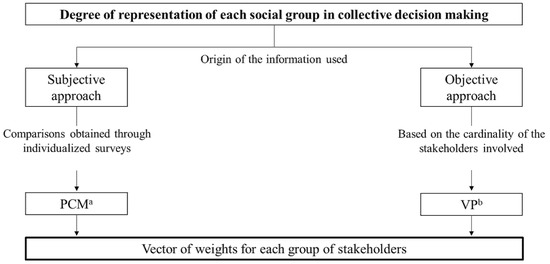 At the moment of integrating the stakeholders’ preferential weights into the decision-making problem, the possibility of directly employing individual preferences or the preferences of each group of stakeholders with a representative weight for each one arises, which is equivalent to the weights of importance for each group of stakeholders in the collective. The representative weights, unlike the preferential ones, underline the importance of each social group involved in the problem, valuing the influence of their opinions in the collective decision. The representative weight of each social group defines the degree of importance (expressed numerically on a scale of 0–1) of the representative person of any social group within a hypothetical committee. These representative weights express the opinion that reflects the common knowledge of the social group that they represent [14]. For these reasons, it is of interest to calculate the weight of the representation in each group of stakeholders within a collective decision problem. There are various methods in the literature that can be used to obtain the representation weight. These start from multicriteria techniques, such as the Analytic Hierarchy Process (AHP), which permits the assignment of the degree of importance of each social group by means of pairwise comparison matrices (PCMs), to the voting power (VP) notion, which uses the cardinality of each group to calculate the degree of importance. In this article, we take into account the diversity of techniques by defining two groups of approaches according to the nature of the information available: the subjective approach and the objective approach. The subjective approach is understood to be the result obtained from the valuation of the stakeholders involved in the decision making, in this case, by means of a system in which the recipients make their perceptions known. In contrast, the objective approach proceeds from the use of the cardinality of the stakeholder groups implicated in the decision making.