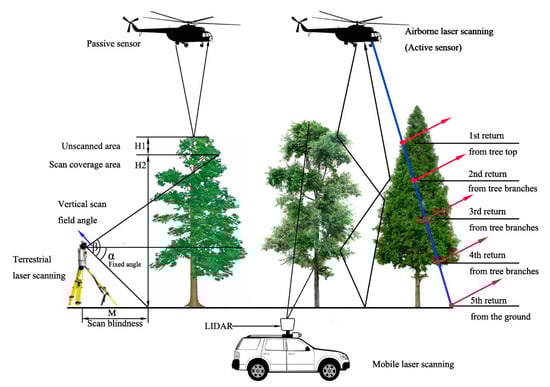 Various studies have reported the successful use of airborne laser scanning (ALS), terrestrial laser scanning (TLS), and mobile laser scanning (MLS) for biomass estimation and 3D structure measurements at the individual tree level [,,] (Figure 2). ALS data have been widely applied to detect individual tree crowns at large scales among these three technologies [,]. Focusing on the urban environment, the results of the Vancouver case study demonstrated that large individual canopies could be mapped with an ALS point cloud-derived raster and an object-based workflow []. The application of high-density ALS data has also proven its potential in the fully automated classification of urban coniferous or deciduous forests [,]. However, given the complexity and heterogeneity of forest structure and composition, ALS may not capture the complete vertical distribution of a crown []. Recently, TLS techniques have been used as a complementary approach to ALS []. They allow DBH, stem density, and crown shape to be obtained by providing a considerable amount of precise information about various forest structure parameters [,]. ALS fills this gap in manual measurements and is more suitable for measuring millimeter-level information, from individual trees to sample plots. Methods using TLS unique distance information are more effective for estimating the leaf area of individual trees in urban areas [,]. The explosive increase in TLS data is revolutionizing the development of methods for automatically calculating individual tree attributes. MLS allows for the quick and cost-effective acquisition of close-range 3D measurements of street objects as part of a new mapping system [,]. It obtains higher point density data and more complete data coverage than the ALS system and performs more efficiently than TLS []. Algorithms combining MLS with digital images or videos have been successfully applied to individual tree detection with geometric parameters []. MLS has the potential to extract information simultaneously and automatically about roadside trees, which is promising for urban forest management [].