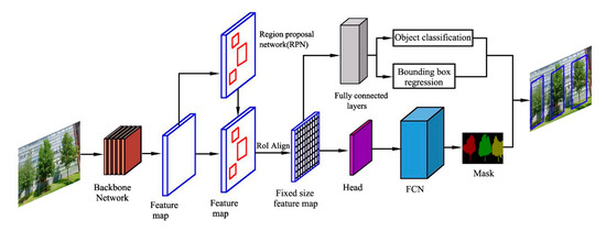 Urban tree detection based on Mask R-CNN and Google Street View imaging. Backbone Network refers to the image as input and extracts “feature maps”; RPN generates the proposal for object detection; RoI (region of interest) is a proposed region from the original image. RoI Align is an operation for extracting a small “feature map” from each RoI in detection and segmentation. FCN represents a fully convolutional network.