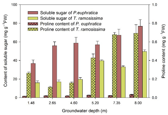 The change of soluble sugar and proline content of Populus euphratica and Tamarix ramosissima grown at different groundwater depths.
