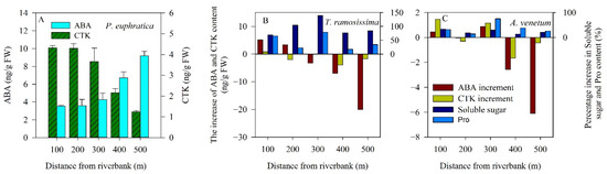 The change of abscisic acid (ABA), cytokinin (CTK) content of Populus euphratica (A), and the increase of ABA, CTK, proline (PRO), and soluble sugar of Tamarix ramosissima (B) and of Apocynum venetum (C) grown at different distance from riverbanks.