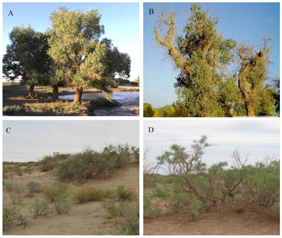 Growth state of Populus euphratica and Tamarix ramosissima at different groundwater depths: (A) Populus euphratica grown at shallow groundwater depth; (B) Populus euphratica grown at deeper groundwater depth; (C) Populus euphratica grown at shallow groundwater depth; (D) Tamarix ramosissima grown at deeper groundwater depth.